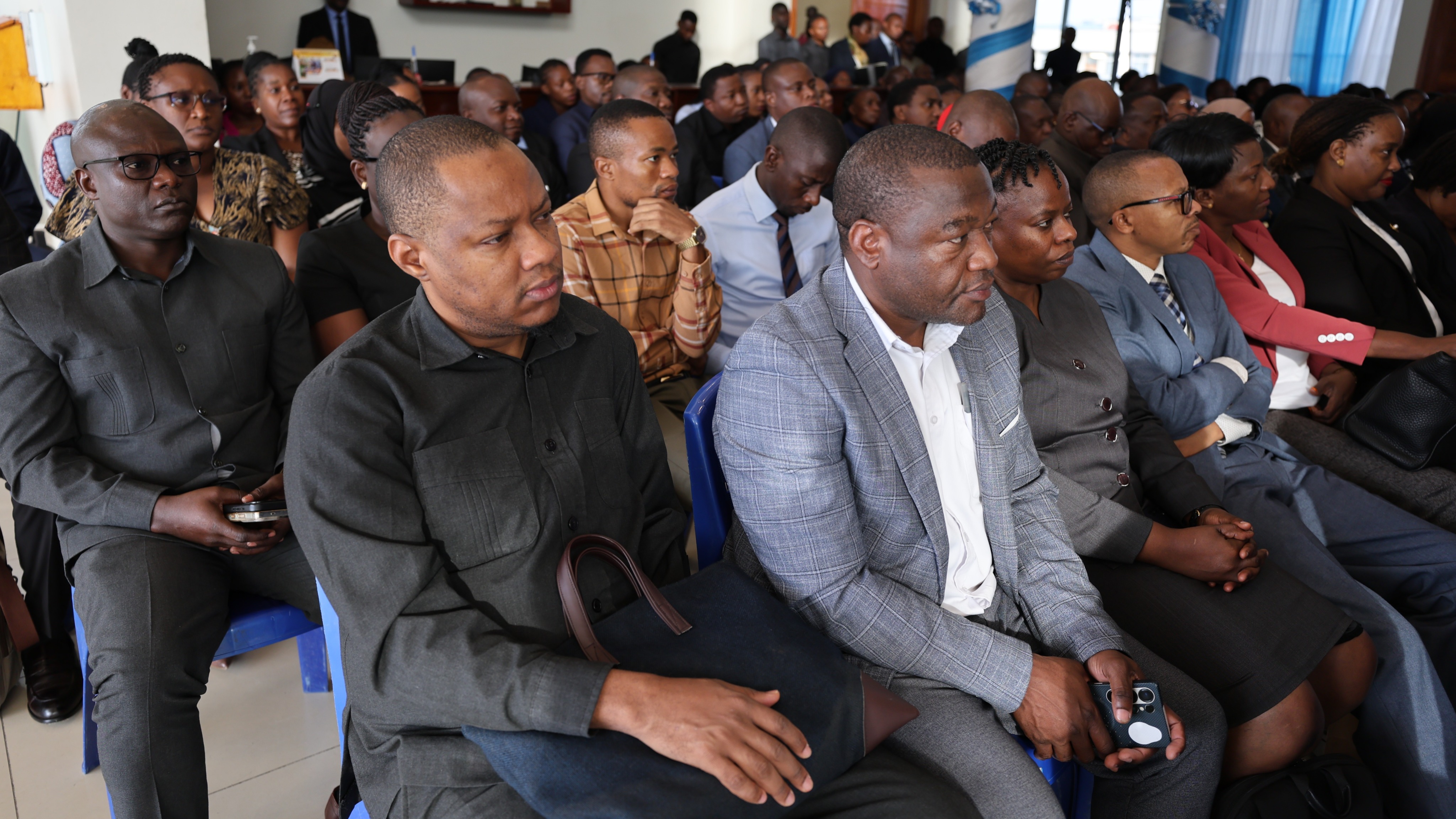 Naibu Katibu Mkuu, Ofisi ya Rais-UTUMISHI na Utawala Bora, Bw. Xavier Daudi akimsikiliza Katibu Mkuu Kiongozi, Balozi Dkt. Moses Kusiluka (hayupo pichani) wakati akifungua mkutano wa sita wa Serikali Mtandao katika Kituo cha Mikutano cha Kimataifa Arusha (AICC) jijini Arusha.