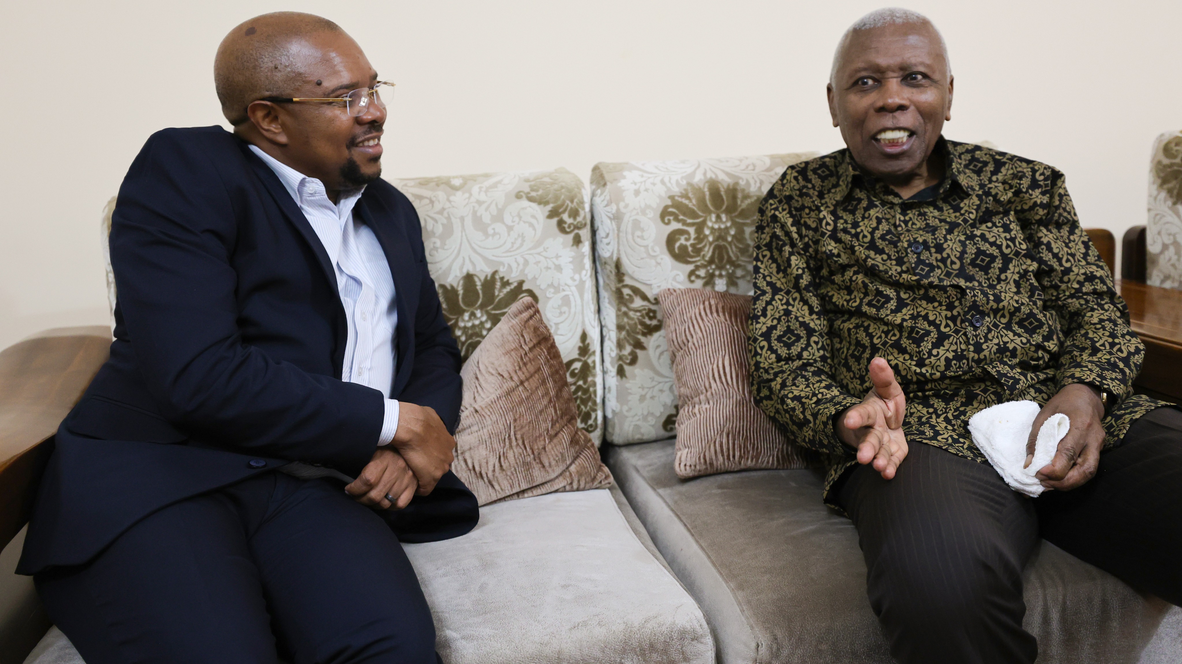 Makamu wa Rais Mstaafu wa Jamhuri ya Muungano wa Tanzania, Dkt. Mohamed Gharib Bilal (kulia) akisisitiza jambo kwa Waziri wa Nchi, Ofisi ya Rais, Menejimenti ya Utumishi wa Umma na Utawala Bora, Mhe. Ridhiwani Kikwete (kushoto) wakati Waziri huyo alipomtembelea nyumbani kwake Mbweni, Wilaya ya Magharibi B, Mkoa wa Mjini, Zanzibar leo tarehe 08 Januari, 2026.